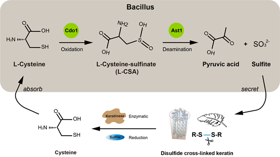 因此,微生物降解角蛋白的关键机制为:半胱氨酸通过分解代谢产生亚硫酸盐,然后分泌到细胞外协助角蛋白酶催化水解角蛋白;角蛋白降解后释放的半胱氨酸进入细胞,继续通过分解代谢转化为亚硫酸盐。这两个过程形成了一个永久的链式反应,使角蛋白充分水解。