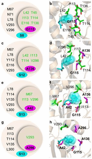 V296A/V293A成功显示出对芳香酮4a, 8a, 12a和13a的特异性。突变体的对接模拟和隧道分析揭示了底物结合口袋的合理扩大以及形成的新的底物通道是特异性扩展的主要原因。该研究不仅为制备芳香族手性胺类化合物提供了高效的生物催化剂,而且所开发的双邻近残基筛选有助于研究者在蛋白质工程构建小而精的诱变文库,从而减少不必要的筛选努力。
