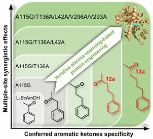 穆晓清副教授团队通过对来自蜡状芽孢杆菌的Bacillus cereus的重组L-BcAmDH进行分子改造,获得了显著拓宽芳香酮底物谱的突变体。通过采用底物行走策略结合开发的双邻近残基筛选策略,作者成功识别了5个显著影响芳香酮底物特异性及催化活性的关键残基,通过5轮迭代丙氨酸扫描诱变策略显著扩展了L-BcAmDH的底物特异性。最终的五点突变体L-BcAmDH-A115G/T136A/L42A/