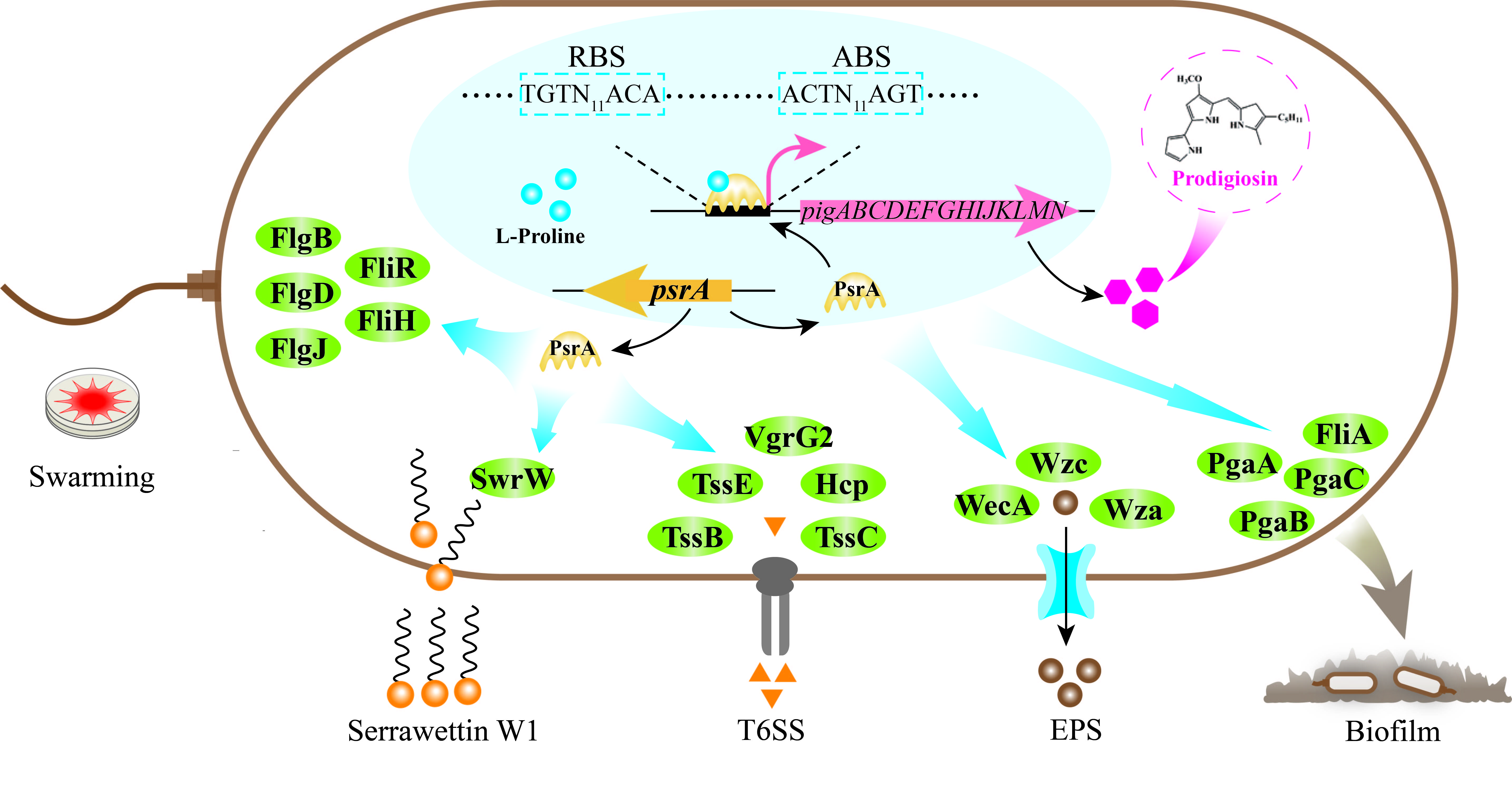 图 粘质沙雷氏菌中转录因子PsrA参与介导粘质沙雷氏菌灵菌红素合成、细胞能动性和胞外多糖的生物合成等多种细胞进程