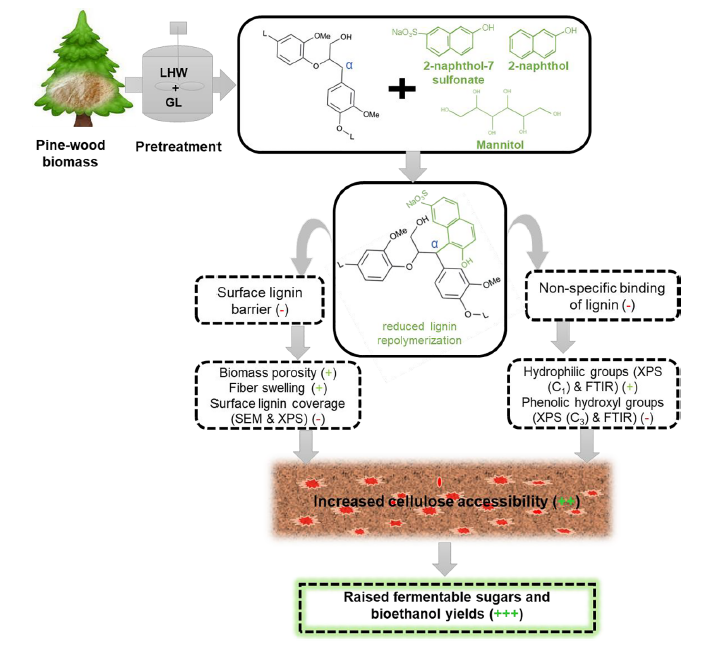 碳达峰和碳中和目标已被纳入全球生态文明建设整体布局,我国“十四五”规划已将它列为必须着手推进的一项重点工作。我国每年可利用的农林纤维剩余物高达20亿吨,这为建立绿色低碳可再生能源体系提供坚实的原料保障。所以,木质纤维素精炼型生物制造已迎来前所未有的历史机遇。酶基生物质精炼工艺通常需要预处理,但预处理成本普遍过高是阻碍其产业化进程的关键技术瓶颈。其原因之一就是,在酸/水热等预处理时会发生木质素再聚合反应,这加剧了后续酶解时木质素表面屏障作用及对纤维素酶的无效吸附,从而严重削弱酶水解效率。针对以上问题,孙付保教授团队通过评估碳正离子清除剂(2-萘酚-7-磺酸盐、2-萘酚和甘露醇)在松木预处理过程中抑制木质素再聚合的有效性,证明这些碳正离子清除剂能有效提高预处理后底物的酶解效率。实验通过现代分析技术手段解析底物的理化结构特征,从而初步阐明碳正离子清除剂促进底物可酶解性的机理:碳正离子清除剂在预处理过程中修饰改进木质素结构,使其含有较少的酚羟基(PhOH)和较多的亲水基团,从而削弱木质素与纤维素酶的非特异性结合;此外,这些碳正离子清除剂也很可能是通过减少底物表面的木质素覆盖率和增加其孔隙率而显著降低了表面木质素的屏障作用。
