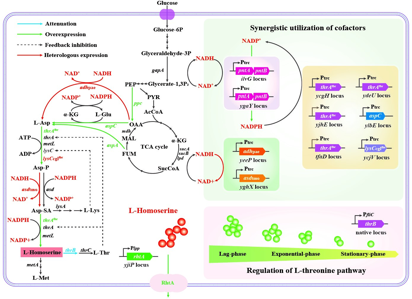 饶志明团队利用系统代谢工程策略将野生型大肠杆菌改造为非营养缺陷型和无质粒的L-高丝氨酸高产菌株。首先,通过调控L-高丝氨酸降解途径并增强合成流量构建了产L-高丝氨酸的初始菌株。然后,基于基因组对L-高丝氨酸生物合成代谢通量进行了优化调整,涉及与前体供应相关的基因ppc、aspC和aspA、L-高丝氨酸合成途径的基因thrAfbr和异源基因lysCfbrcgl,并通过修饰转运系统促进L-高丝氨酸外排。最后,针对氧化还原辅因子对L-高丝氨酸合成的重要性,提出一种辅因子协同利用的策略,通过促进NADPH再生,以及引入异源的利用NADH的脱氢酶来协调菌体内的氧化还原辅因子水平,从而进一步提高了L-高丝氨酸的生产。最终构建的工程菌株为非营养缺陷型,且发酵过程中无需添加抗生素、无需诱导,其在5 L分批补料发酵中可以生产85.29 g/L L-高丝氨酸,是无质粒且非营养缺陷型菌株报道的最高生产水平。