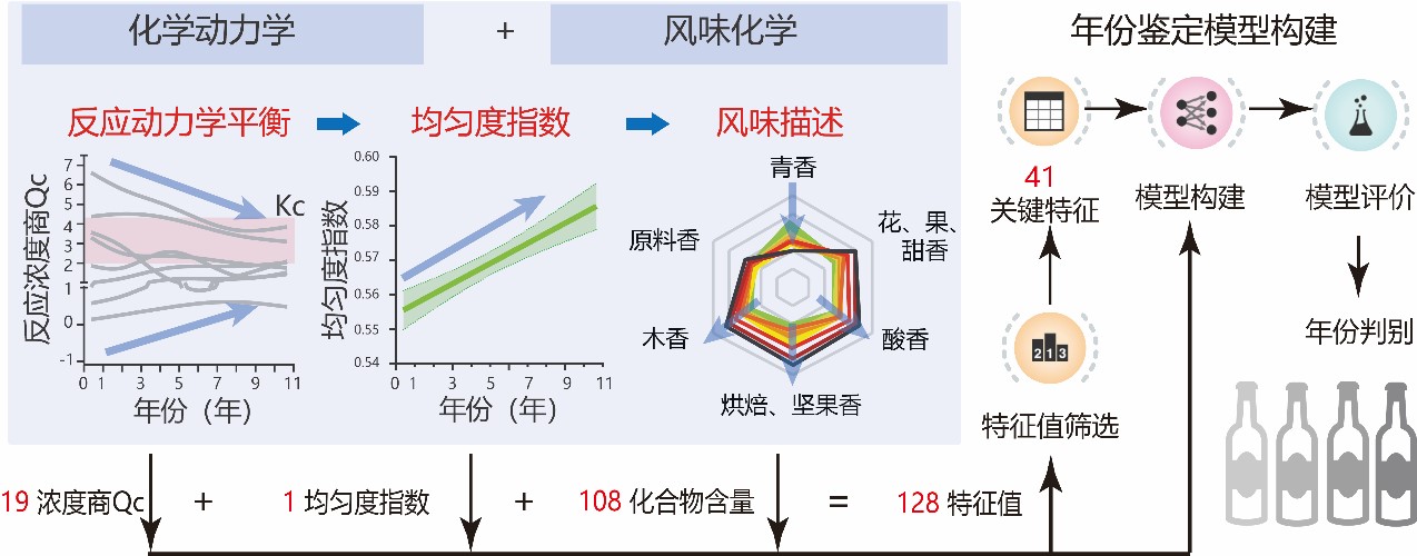 许正宏教授团队针对这一问题,首先定量分析了瓶贮时间在0-11年之间的国窖1573样品中各类化合物含量,创新提出了与陈酿时间密切正相关的风味物质均匀度(Evenness)指数;并从可逆反应化学动力学的角度分析了各年份样品中主要乙酯化反应的浓度商(Qc),发现随着陈放时间的增加,大多数反应的Qc趋向于热力学平衡常数Kc,即反应是向着体系自由能降低的方向发展;继而,通过特征值筛选,获得了系列包含均匀度和浓度商的特征参数,在此基础上构建了基于神经网络的国窖1573年份酒鉴定模型。