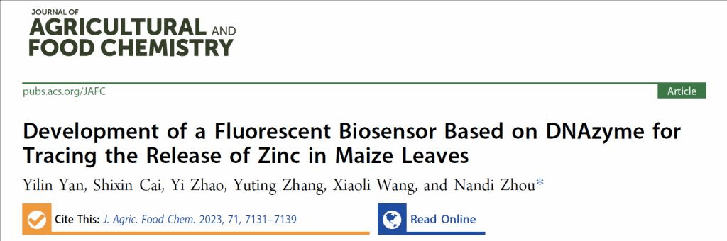 近期,beat365官网beat365中文官网周楠迪教授团队在荧光生物传感器方面取得重要进展,研究成果“Development of a fluorescent biosensor based on DNAzyme for tracing the release of zinc in maize leaves”正式发表于Journal of Agricultural and Food Chemistry (IF =/info/1021/ /5.895) (https://pubs.acs.org/doi/10.1021/acs.jafc.3c00508)。