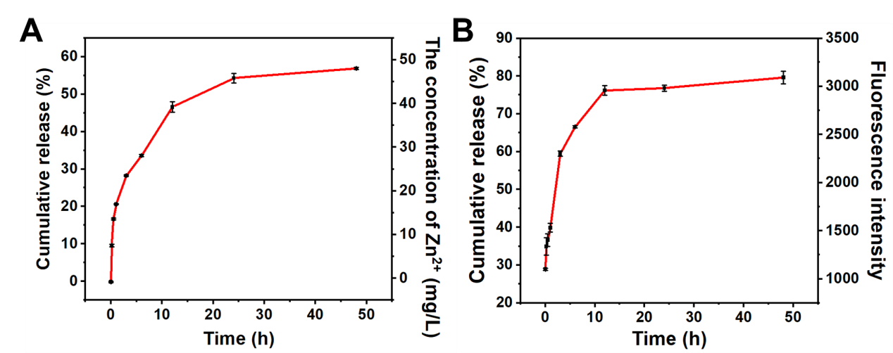 图3(A)利用原子吸收分光光度法测定Zn2+从ZnO@Au NPs的释放曲线;(B)利用荧光生物传感器测定从ZnO@Au NPs-hairpin DNA中Zn2+的释放