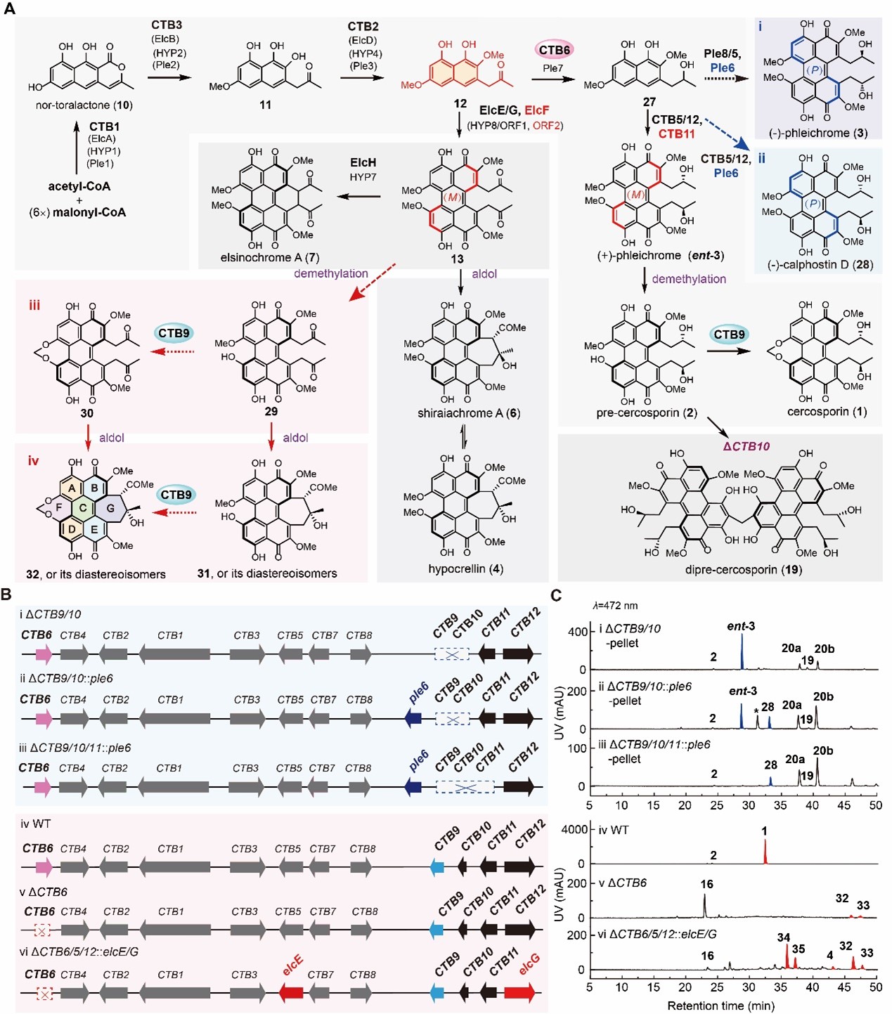 首先,作者以实验室分离保存的尾孢菌素高产菌株Cercospora sp. JNU001为研究对象,通过基因敲除、体外重构以及生物信息学分析揭示了B类苝醌天然产物由共同前体经分支酶的修饰形成产物多样性和复杂性的机制(图1A),然后以尾孢菌素生物合成基因簇为模板,通过分支酶的敲除和引入获得了一系列重编程的基因簇,不仅实现了苝醌化合物轴手性的改造,还获得了一系列具有不同取代基的非天然苝醌化合物(图1B)。