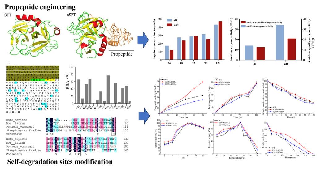 近期,beat365官网beat365中文官网李崎教授团队在胰蛋白酶表达量提升方面取得重要进展,研究成果“Enhanced expression of a novel trypsin from Streptomyces fradiae in Komagataella phaffii GS115 through combinational strategies of propeptide engineering and self-degredation sites modification”正式发表于International Journal of Biological Macromolecules (IF =/info/1021/ /8.20) (https://doi.org/10.1016/j.ijbiomac.2023.127382)。