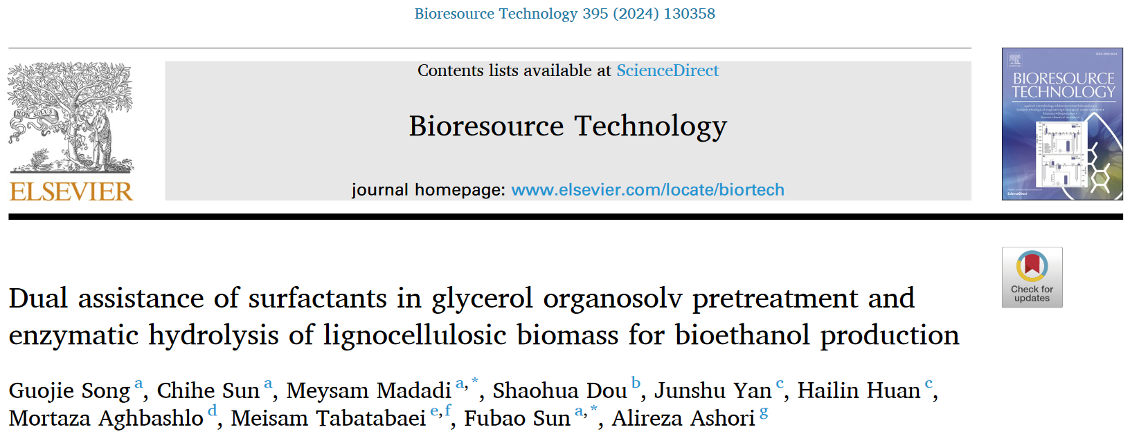 近期,beat365官网beat365中文官网生物资源与生物炼制研究团队在木质纤维素生物质转化制燃料乙醇方面取得重要进展,并发表研究成果“Dual assistance of surfactants in glycerol organosolv pretreatment and enzymatic hydrolysis of lignocellulosic biomass for bioethanol production, 2024, 395: 130358 (一区, Top, IF 11.4)