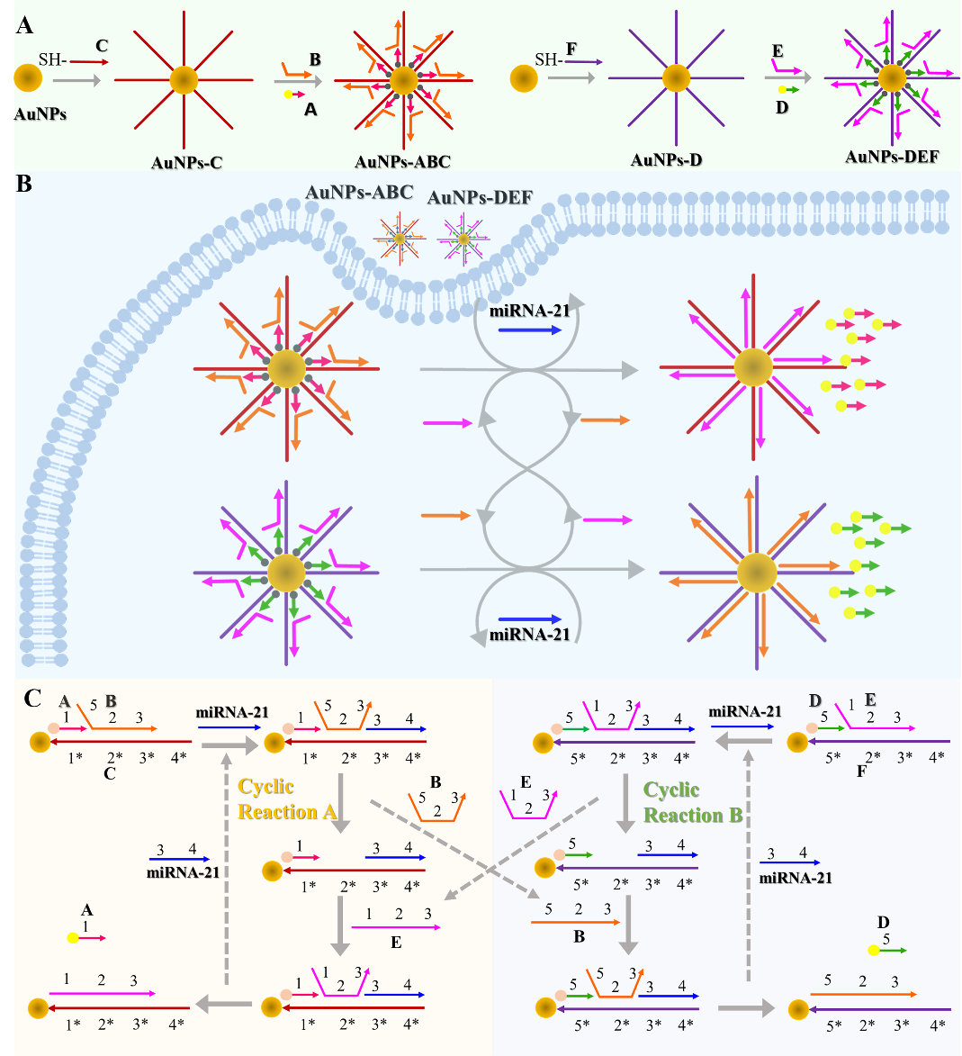 该研究报道了一种在金纳米粒子(AuNPs)表面构建的双熵驱动扩增系统,以实现miRNA-21的荧光测定和细胞内成像。双熵驱动的放大策略将燃料链内部化,以避免传统熵驱动放大策略中额外添加的复杂性。独特的自锁燃料链系统是通过将三链结构附着在两组AuNPs上而建立的,其中Cy5荧光标记首先被AuNPs猝灭。靶标miRNA-21被识别后,燃料链将自动解锁,并驱动循环反应,导致荧光恢复。自供电和回收燃料链大大提高了反应过程的自动化和智能化(图1)。