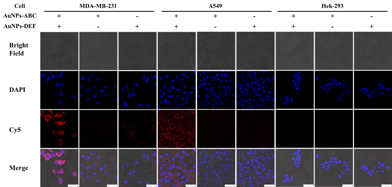 图2 双熵驱动扩增系统的细胞内验证。蓝色:DAPI(激发:405 nm,发射:420-460 nm)和红色:Cy5(激发:650 nm,发射660-700 nm)。比例尺:50 μm。