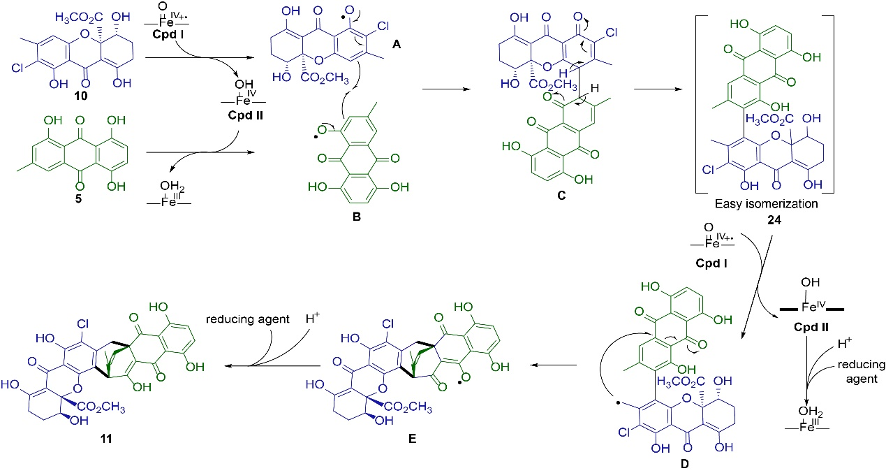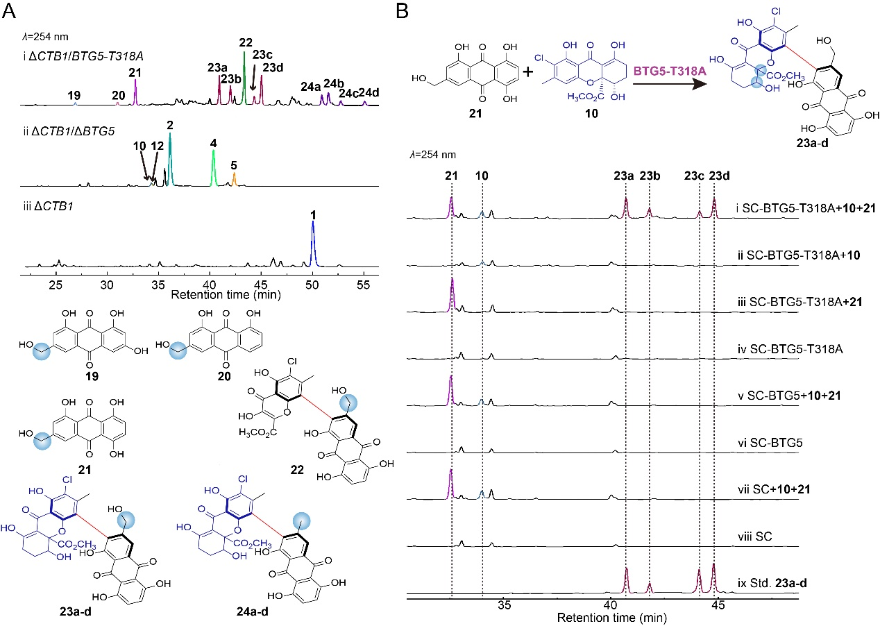 由于酵母转化效率较低,为了表征潜在产物,在尾孢菌ΔCTB1菌株中用BTG5-T318A代替BTG5构建点突变株,与ΔCTB1菌株和ΔCTB1/ΔBTG5菌株的代谢谱相比,发现了大量的新峰,其中发现大黄素、大黄酚和长蠕孢素的C11甲基被氧化,分别产生了羟基大黄素、芦荟大黄素和羟基长蠕孢素。此外,在低温条件下成功纯化了23d和24d并进行结构表征,结果表明23d是卤代氧杂蒽酮和羟基长蠕孢素的二聚化产物,酵母异源表达实验也验证了这一点;24d则是原始底物卤代氧杂蒽酮和长蠕孢素的二聚产物(图3)。这表明BTG5-T318不仅可以控制蒽醌部分的底物选择性,还可以调节二聚化或双环[3.2.2]壬烷骨架形成的催化反应。