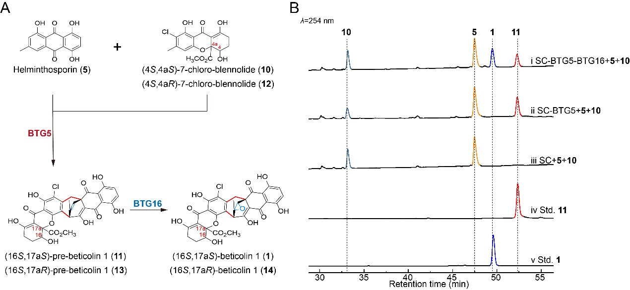 首先,作者通过基因敲除发现P450 BTG5可能负责beticolin双环[3.2.2]壬烷骨架的构建,为了验证以上的猜想,在酵母细胞中进行异源重构,发现beticolin的蒽醌部分和卤代氧杂蒽酮部分可以在BTG5催化下构建罕见的双环[3.2.2]壬烷骨架以合成pre-beticolin 1,其在BTG16催化下而形成beticolin 1(图1)。