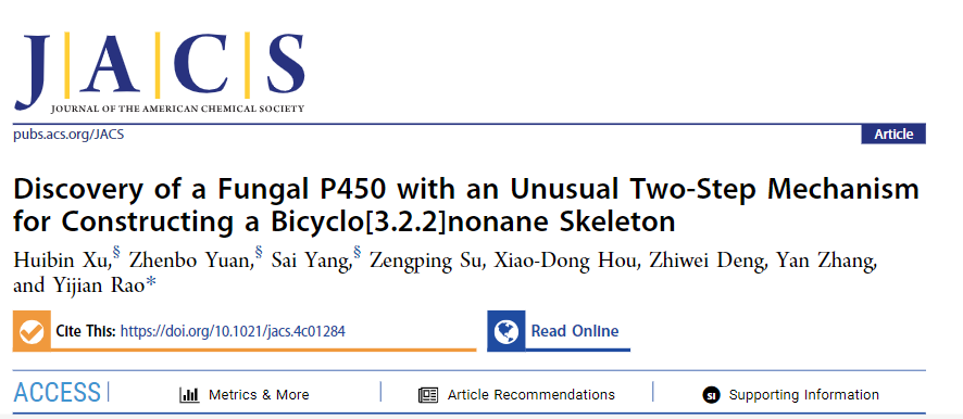 近期,beat365官网beat365中文官网饶义剑教授团队在真菌P450构筑特殊药物基团双环[3.2.2]壬烷骨架的罕见两步催化机制研究方面取得重要进展,研究成果“Discovery of a fungal P450 with an unusual two-step mechanism for constructing bicyclo[3.2.2]nonane skeleton”在线发表于化学顶刊J Am Chem Soc (IF =/info/1021/ /15.0) (https://doi.org/10.1021/jacs.4c01284)。