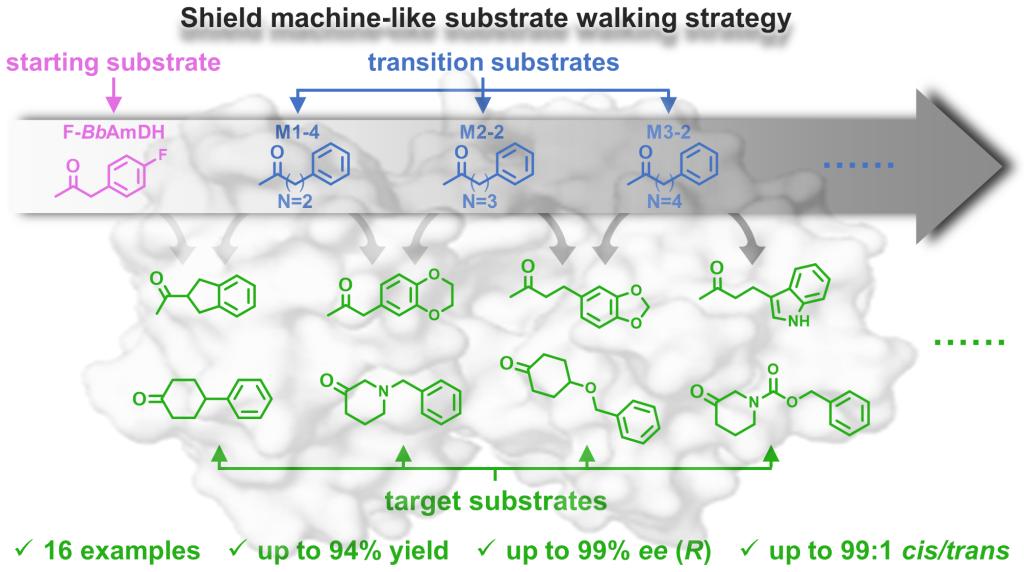 为了提高进化成功率并减轻筛选工作量,研究人员在传统底物行走策略的基础上,设计了一种使用多过渡底物的盾构机式底物行走策略。该策略的原理是基于底物分子尺寸的匹配性,选择一组苯环位于底物侧链末端且碳骨架规则延伸的单环芳香酮同系物作为过渡底物,利用过渡底物分子结构中苯环位置的逐步延伸来创造底物结合空间,以满足结构多样的稠环和连环酮底物结合的空间需求。研究人员以源于栗褐芽孢杆菌(Bacillus badius)的胺脱氢酶为出发酶,基于盾构机式底物行走策略对其进行底物特异性进化。以所选过渡底物的活性提高和特异性拓展为多尺度的筛选指标,从库容量仅为58株定点突变体的突变文库中筛选出9株阳性突变体。在未进行额外突变实验下,9株阳性突变体显示出显著拓展的稠环和连环酮底物范围,并以高达94%的产率和>99% ee (R)或>99:1顺式/反式实现系列高附加值手性稠环和连环胺的生物胺化制备。此外,基于酶-底物复合物结构的特征分析提供了对拓展底物特异性来源的分子见解。本研究展示了一种简洁的工程流程,可用于结构多样的底物集合的底物特异性快速进化,在酶工程中具有潜在的应用前景。