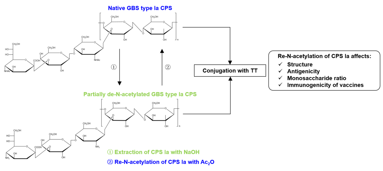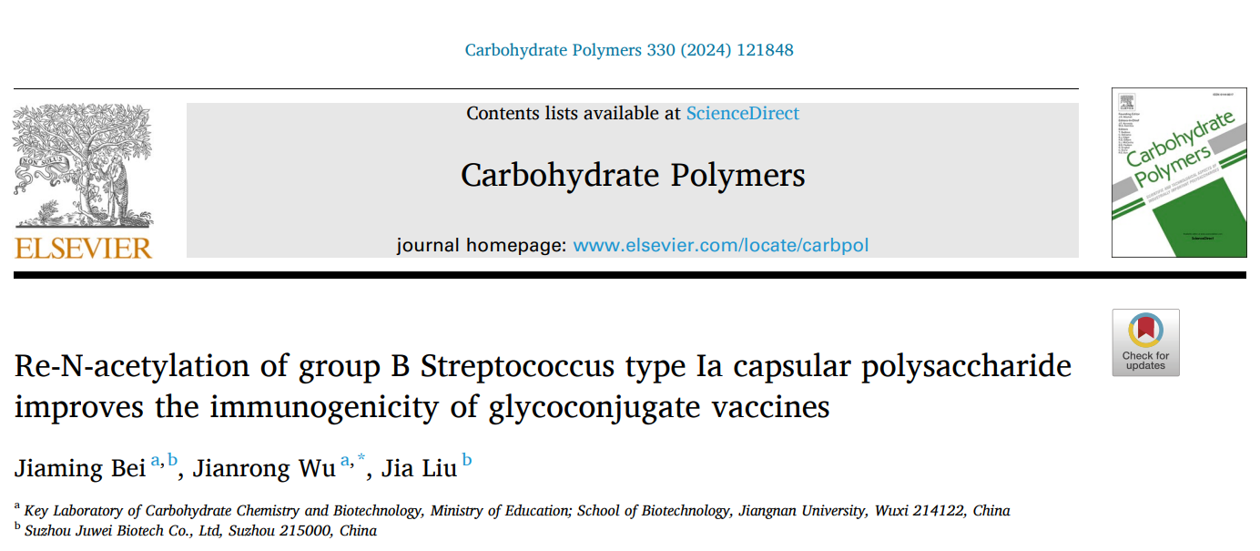 近期,beat365官网beat365中文官网高敏杰团队吴剑荣老师在Ia型B族链球菌荚膜多糖的结构与功能方面研究取得重要进展,研究成果“Re-N-acetylation of group B Streptococcus type Ia capsular polysaccharide improves the immunogenicity of glycoconjugate vaccines”正式发表于Carbohydrate Polymers (IF =/info/1021/ /11.2) (https://doi.org/10.1016/j.carbpol.2024.121848)。
