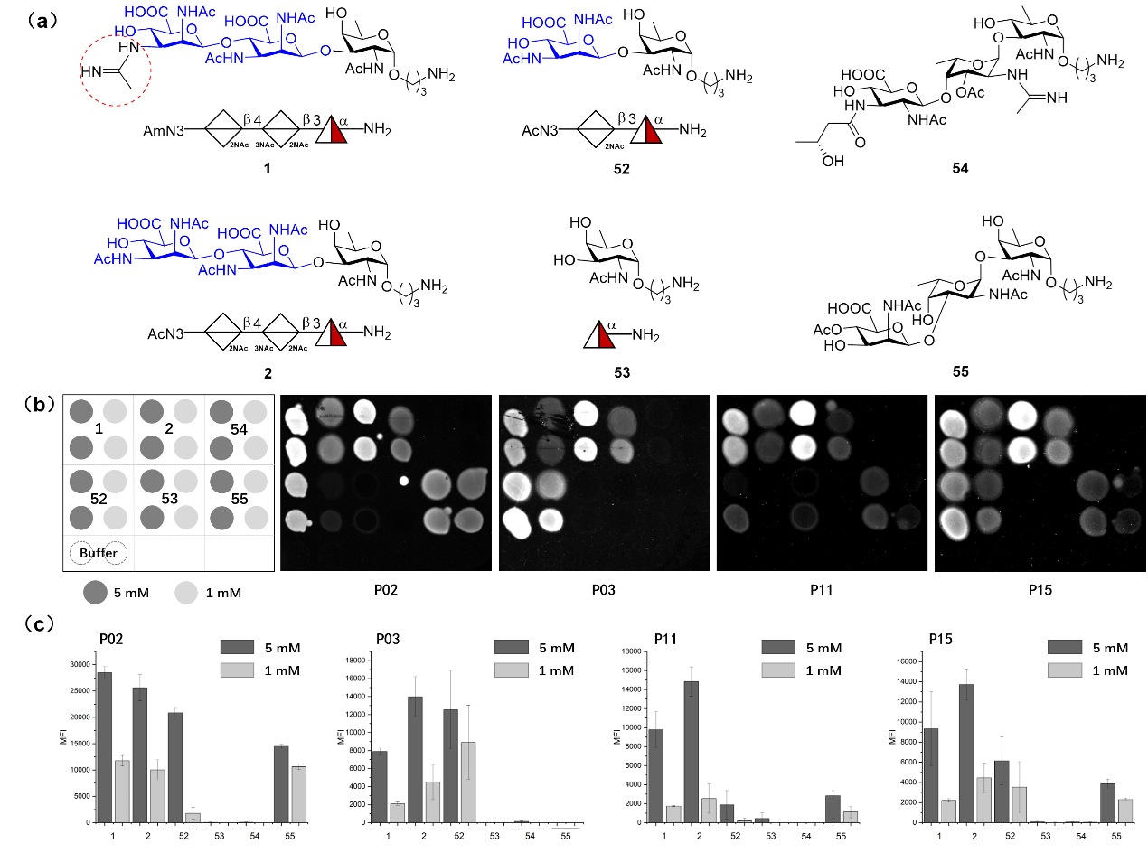 此外,为了评价O5血清型O-抗原寡糖片段的抗原性,进一步制备了无乙脒基三糖、还原端二糖和D-岩藻糖胺等寡糖片段(图3)。通过糖芯片技术,利用16名绿脓杆菌感染患者和16名健康供体的血清样品(阴性对照)对合成寡糖的抗原性进行筛选。糖芯片分析结果显示,尽管绿脓杆菌血清型分布有所不同,目标三糖1和2可以被大多数患者的血清样本中IgG抗体识别(14/16)。值得注意的是,三糖2(无乙脒基)与IgG抗体结合亲和力比三糖1的更强,该结果表明,稀有乙脒基并不是O5血清型O-抗原抗原性的关键决定因素。与三糖2相比,仅含有一个β-D-ManpNAc3NAcA基序的二糖52,同样能被大多数患者血清样本中IgG抗体识别,但其结合亲和力较弱,表明关键β-D-ManpNAc3NAcA基序对其抗原性具有重要作用。通过健康供体血清的筛选结果显示,大多数血清样本无法识别O5血清型O-抗原的合成寡糖,表明绿脓杆菌感染患者血清中的IgG抗体可以特异性靶向三糖1和2。上述结果表明,两种三糖均为绿脓杆菌O5血清型O-抗原的有效抗原表位,且乙脒基并非构成O-抗原抗原性的关键结构因子,稀有糖β-D-ManpNAc3NacA是O-抗原抗原性的关键组成片段。本研究结果为绿脓杆菌O5血清型O-抗原疫苗的研发提供了理论基础。