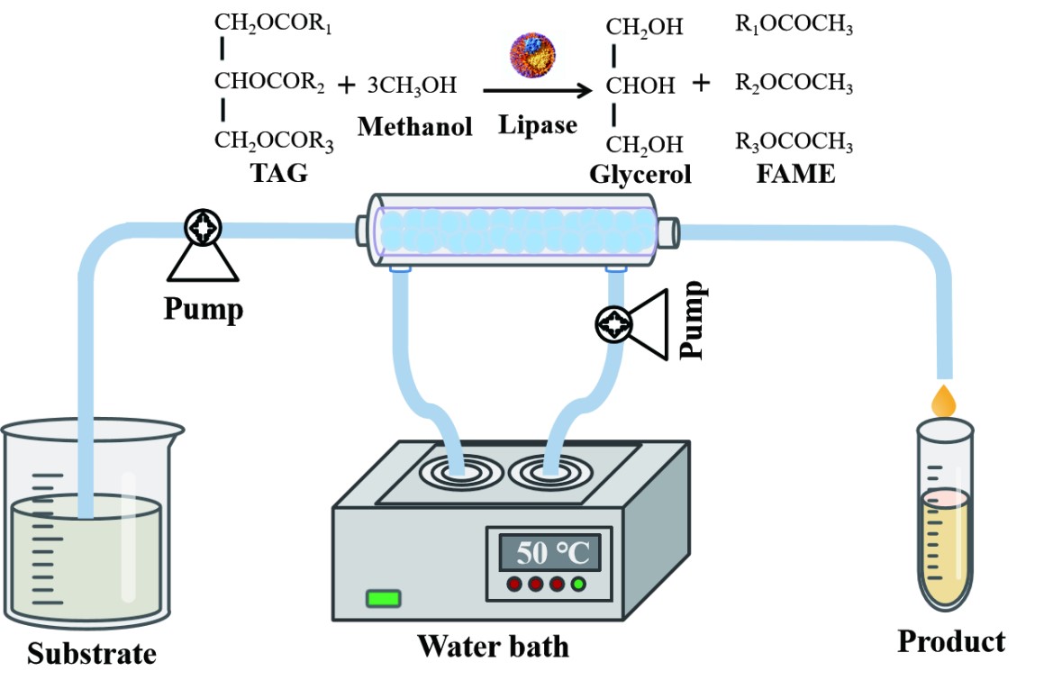 首先通过理性改造获得LIPR热稳定性和活性均提高的二硫键突变体。随后,通过计算折叠自由能(ΔΔG)的变化,将第214位氨基酸位点突变为疏水氨基酸,得到热稳定性和活性进一步显著提升的突变体。为了在毕赤酵母中实现LIPR的高效表达,进行了一系列组合优化,包括使用信号肽Mss、共表达分子伴侣PDI、敲除液泡分选受体VPS10-01以及过表达二羟丙酮合成酶DAS2。最终,经组合优化的突变菌株GS54在5 L生物反应器中进行高密度发酵培养,酶活达到13620 U/mL。此外,还验证了突变体GS54-LIPR的生物柴油合成能力,其在摇瓶中反应24小时后,生物柴油产率为52.2%,是未经改造LIPR的4.3倍。最后,采用连续流动系统在3小时内将生物柴油产率进一步提高到73.6%,证明了连续流反应器在增强酶生物催化方面的作用。上述结果表明工程化的GS54-LIPR突变体脂肪酶是一种高效的生物催化剂,可在连续流动反应中持续生产生物柴油。