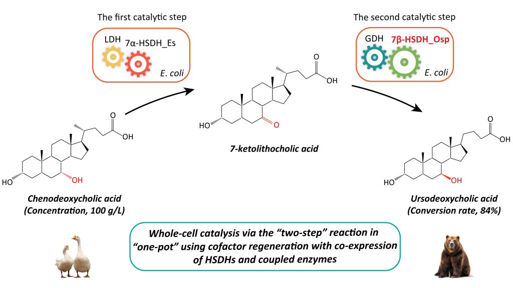 陈献忠教授团队针对上述问题,首先,筛选获得来自Olsenella sp.的 7β-HSDH_Osp,其具有优良的酶学特性(如高转化率),并在大肠杆菌中实现了高效异源表达。与7α-羟基类固醇脱氢酶结合,在辅因子自循环、7β-HSDH_Osp和7α-HSDH_Cd单独表达的“一锅法”催化系统的最佳条件下,催化鹅去氧胆酸(CDCA)为UDCA的转化率达到68.3%。对于使用辅因子自循环并共表达7β-HSDH_Osp和7α-HSDH_Cd的级联“一锅法”催化系统,通过全细胞催化从CDCA到UDCA的转化率高于游离酶的转化率。辅因子NADH再生系统比辅因子NADPH再生系统,更有利于7β-HSDH_Osp催化CDCA生产中间体7K-LCA。使用辅因子再生、共表达7α-HSDH_Es和LDH以及7β-HSDH_Osp和GDH的“一锅两步法”反应,其催化CDCA到UDCA的转化率最高,达81%。与单独表达 HSDH(7β-HSDH_Osp 和 7α-HSDH_Es)和偶联酶的辅因子再生相比,通过“一锅两步法”反应,催化CDCA至UDCA的转化率达90.25%。基于上述优化后催化工艺,可以实现高浓度(100 g·L-1)CDCA到UDCA的高效转化,其转化率达到84%。本研究获得的7β-HSDH_Osp及其优化的UDAC催化生产工艺对其绿色工业生产具有重要意义。