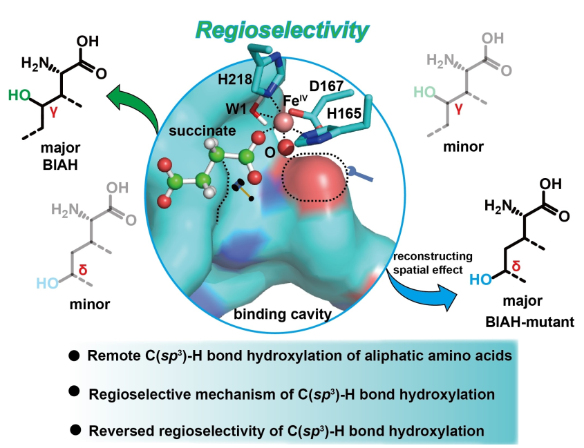 近期,beat365官网beat365中文官网刘立明教授团队在脂肪族氨基酸远程C(sp3)-H键羟基化区域选择性调控方面取得重要进展,研究成果“Rational Design of the Spatial Effect in a Fe(II)/α-Ketoglutarate Dependent Dioxygenase Reverses the Regioselectivity of C(sp3)-H Bond Hydroxylation in Aliphatic Amino Acids”正式发表于Angewandte Chemie International Edition (IF =/info/1021/ /16.1) (https://doi.org/10.1002/anie.202406060)。