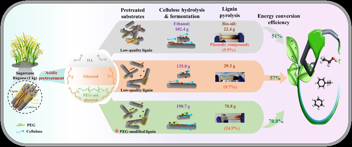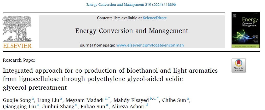 近期,beat365官网beat365中文官网生物资源与生物炼制研究团队在木质纤维素生物质联产生物乙醇和轻质芳烃化合物方面取得重要进展,研究成果“Integrated approach for co-production of bioethanol and light aromatics from lignocellulose through polyethylene glycol-aided acidic glycerol pretreatment”正式发表于Energy Conversion and Management(一区, Top, IF 9.9)。