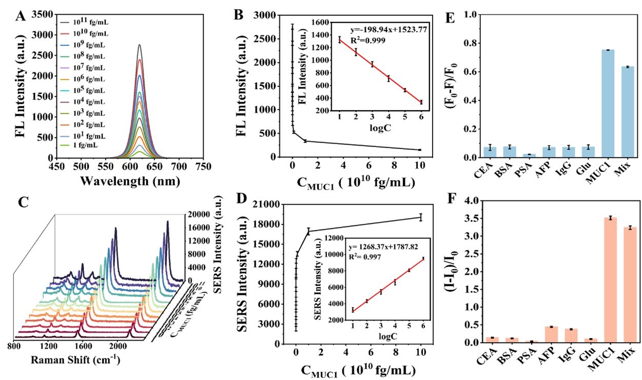 图 2.(A) MUC1 浓度梯度下 FL-SERS 生物传感器的 FL 谱图。(B) 620 nm 处 FL 强度和 MUC1 浓度的校准曲线。插图显示了 620 nm 处的 FL 强度与 MUC1 浓度的对数之间的线性关系。(C) MUC1 浓度梯度下 FL-SERS 生物传感器的 SERS 谱图;(D) 2120 cm-1 和 MUC1 浓度下的 SERS 强度校准曲线。插图显示了 2120 cm-1 处的 SERS 强度与 MUC1 浓度对数之间的线性关系; FL-SERS 生物传感器在 FL 模式 (E) 和 SERS 模式 (F) 中对 MUC1 和其他干扰物质的选择性。