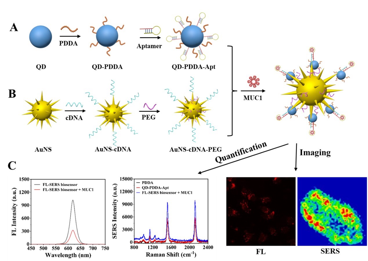 图1. 用于 MUC1 检测和成像的 FL-SERS 生物传感器示意图。(A) QD-PDDA-Apt合成;(b) AuNS-cDNA-PEG 的合成;(C) 使用构建的生物传感器对活细胞中的 MUC1 进行检测和成像。