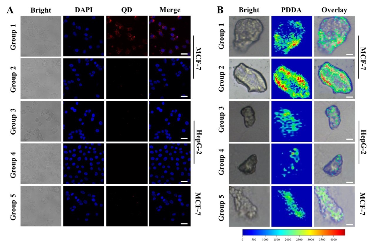 图 3.(A) 共聚焦成像和 (B) 使用 FL-SERS 生物传感器对不同细胞中的 MUC1 进行拉曼成像。第 1 组是 MCF-7 细胞的 QD-PDDA-Apt,第 2 组是 MCF-7 细胞的 QD-PDDA-Apt 和 AuNS-cDNA-PEG,第 3 组是 HepG-2 细胞的 QD-PDDA-Apt 和 AuNS-cDNA-PEG,第 5 组是 MCF-7 细胞的 MUC1 mAb、QD-PDDA-Apt 和 AuNS-cDNA-PEG。