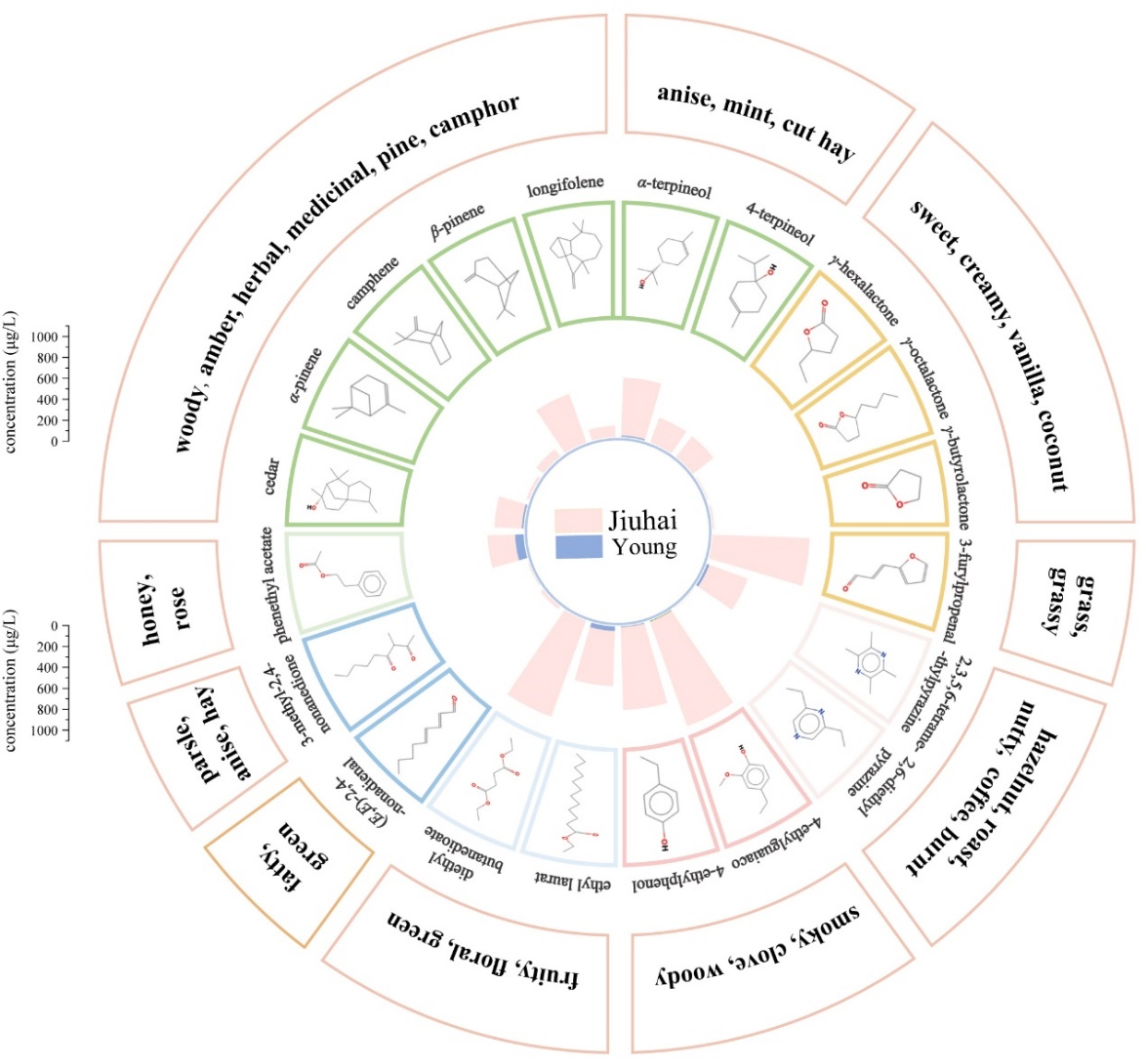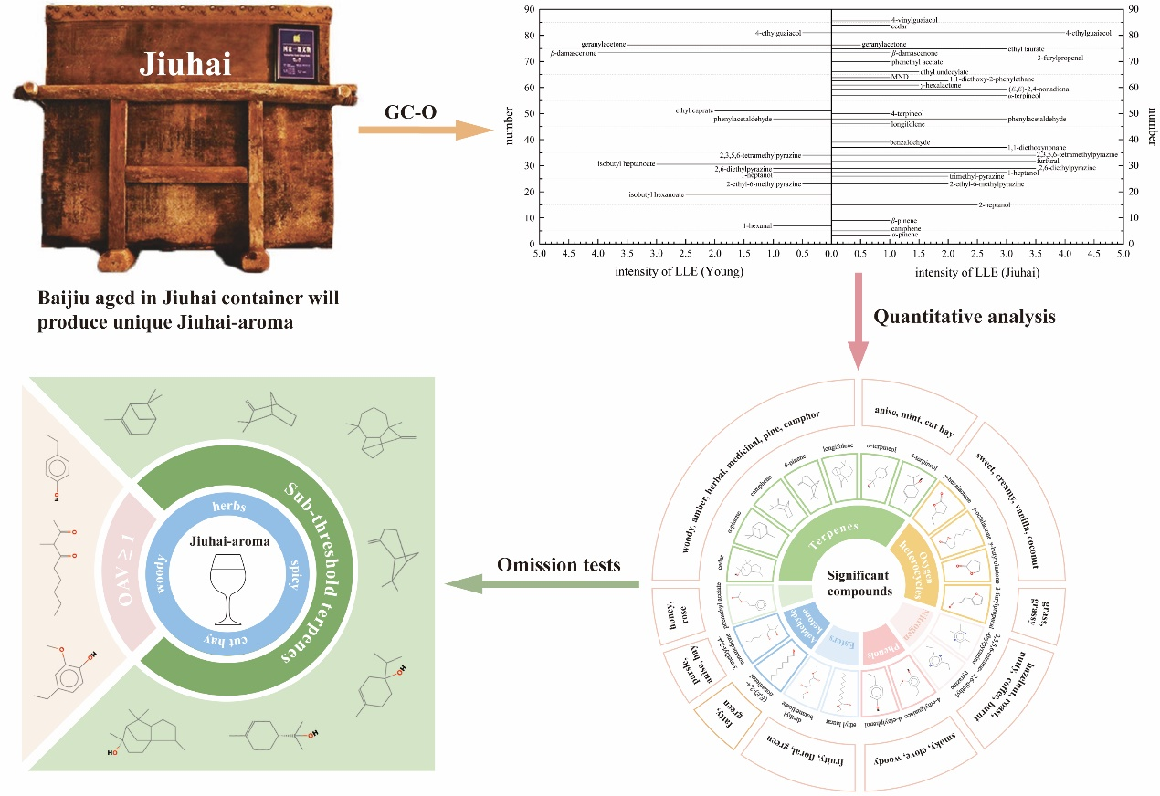 本研究采用适合项勾选法(check-all-that-apply,CATA)和定量描述分析法(quantitative descriptive analysis,QDA)对酒海味的香气特征进行系统表征,发现酒海味是一种复合香气,融合了草药、香料、干草和木质属性的协调香气;使用分子感官科学的方法对酒海贮酒样品的重要香气物质进行了解析,发现酒海贮酒的香气化合物种类(71种)多于新酒(54种),以萜类和芳香族化合物为主;定量结果表明酒海贮酒中的萜类、吡嗪、内酯和酚类的含量高于新酒;通过香气重组和缺失实验证了酒海老熟风味关联的关键香气物质。同时研究发现处于亚阈值浓度的7种萜类也可以通过相互作用对酒海味产生重要影响;使用Feller模型发现这7种亚阈值萜类之间大多具有协同和加成作用,进一步证实了亚阈值化合物之间的相互作用可以促进香气感知。本研究在国际上首次系统解析了中国传统木酒海贮酒形成的独特风味的化学本质,丰富了白酒酒海贮存老熟风味化学机理的认识。