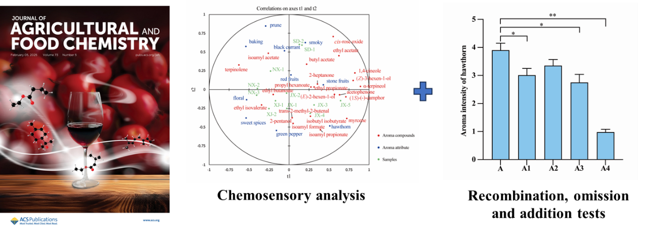 近日,beat365官网生物工程学院徐岩教授团队唐柯副教授在葡萄酒山楂特征风味解析方面取得重要进展,相关研究成果“Characterization of odorants causing the hawthorn aroma in Cabernet Sauvignon wine by gas chromatography-olfactometry, quantitation, aroma recombination, omission and addition studies”以封面文章发表于Journal of Agricultural and Food Chemistry(一区, Top, IF 5.7)(https://pubs.acs.org/doi/10.1021/acs.jafc.4c09533)。
