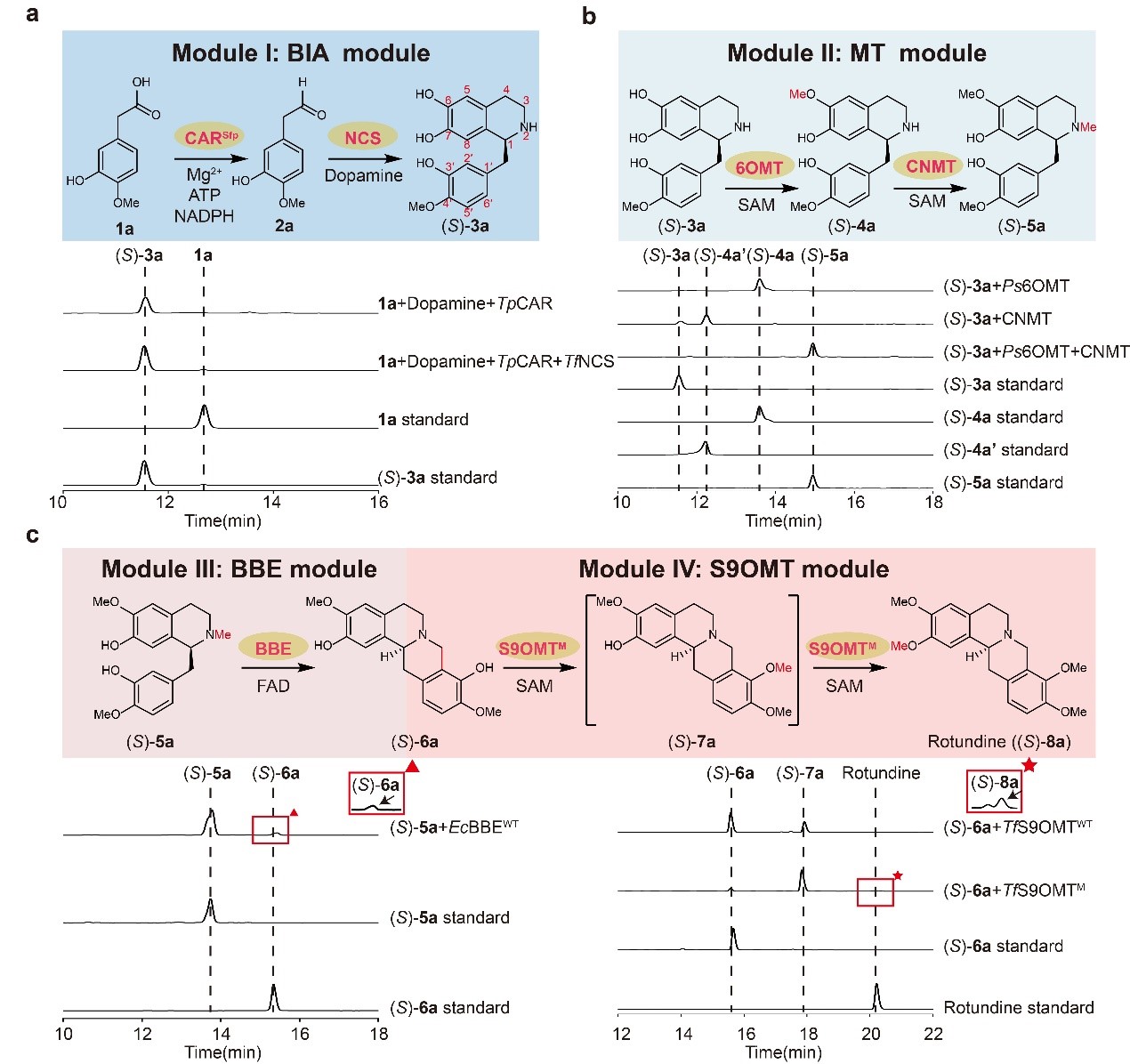 综上所述,本研究构建了一个高效的酶级联反应系统,成功实现了原小檗碱类生物碱及其卤代衍生物的高效合成,克服了原小檗碱类生物碱生物合成的固有难题;实现了天然镇痛药罗通定的克级合成,为其工业化生产提供了新的策略和技术手段,充分展示了中药现代化进程中的创新实践,是新质生产力成功应用的典范。