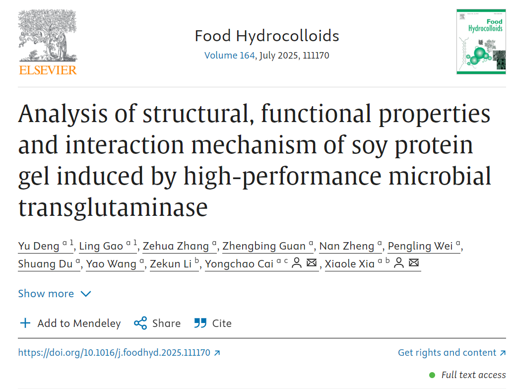 近期,beat365官网beat365中文官网夏小乐教授团队在微生物来源谷氨酰胺转氨酶(MTG)的改造与应用研究中取得新进展,研究结果“Analysis of structural, functional properties and interaction mechanism of soy protein gel induced by high-performance microbial transglutaminase”正式发表于Food Hydrocolloids(一区TOP期刊,IF=11.0) (https://doi.org/10.1016/j.foodhyd.2025.111170)。