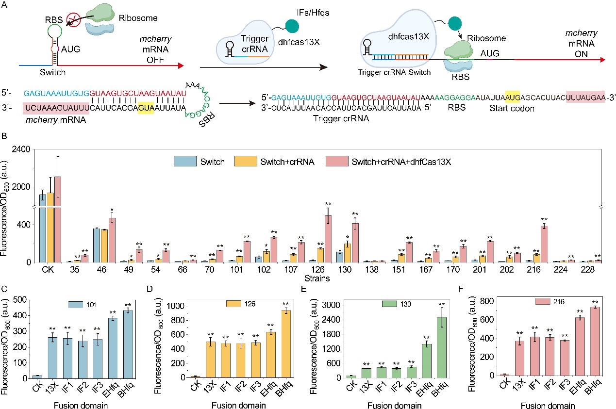 其次,将dhfCas13X与翻译起始因子IFs或RNA结合蛋白Hfq融合,构建了可激活基因翻译的DiCRISPRa (Degradation-inhibited CRISPRa)系统,其中,crRNA能够靶向核酸酶识别位点,阻止mRNA的降解,从而激活下游基因的表达(图4)。为进一步增加激活效果,设计构建了TsCRISPRa (Translation-started CRISPRa)系统,在Trigger crRNA的引导下,dhfCas13X-hfq能够打开靶标mRNA 5’-UTR处的Switch结构,激活mRNA的翻译,激活效果达43.2倍(图5)。最后,将构建的CRISPRi/a系统应用于2’-岩藻糖基乳糖(2’-FL)和核黄素代谢网络的全局调控,使它们的产量分别提高1.2倍和3.0倍(图6)。相关研究为翻译水平的基因表达调控提供了新工具,也为CRISPRa系统的构建提供了新思路。