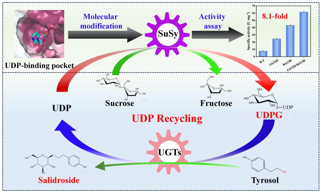 UDP-葡萄糖(UDPG)是一种重要的核苷二磷酸糖,它是生物合成各种糖苷类化合物的重要糖供体。蔗糖合酶(SuSy)广泛存在于植物和细菌中,其可以催化低成本的蔗糖合成高价值的UDPG,并且其与尿苷二磷酸糖基转移酶(UGTs)的级联催化体系更可显著提升UDPG的循环利用效率。然而现有SuSy存在显著局限性:植物SuSy虽对UDP具有较高亲和力,但其热稳定性难以满足工业化需求;而热稳定性更优的细菌SuSy却表现出较低的UDP催化活性。