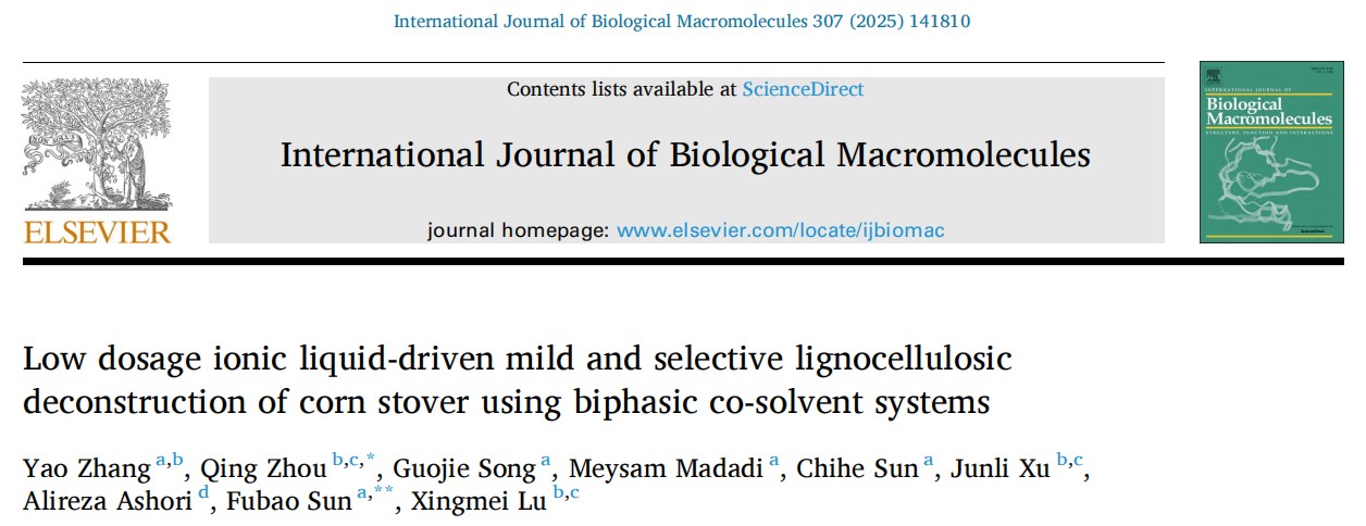 近期,beat365官网beat365中文官网生物资源与生物炼制研究团队在质子型离子液体高效拆解木质纤维素生物质方面取得重要进展,研究成果“Low dosage ionic liquid-driven mild and selective lignocellulosic deconstruction of corn stover using biphasic co-solvent systems”正式发表于International Journal of Biological Macromolecules(一区, Top, IF 7.7)。