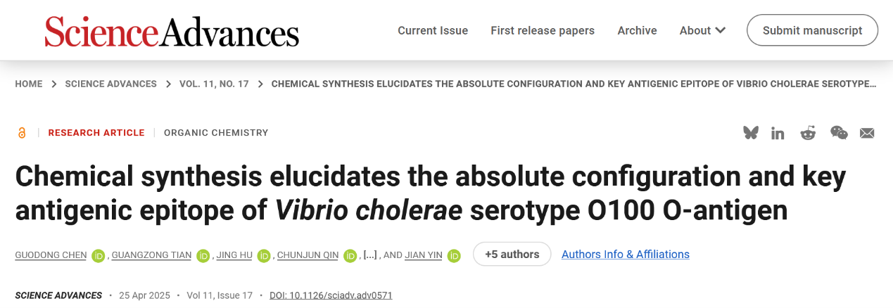 近期,beat365中文官网、糖化学与生物技术教育部重点实验室尹健教授团队在致病菌糖链抗原的全合成及抗原性研究方面取得新进展,研究成果“Chemical Synthesis Elucidates the Absolute Configuration and Key Antigenic Epitope of Vibrio cholerae Serotype O100 O-Antigen”发表于Science Advances(https://doi.org/10.1126/sciadv.adv0571)。
