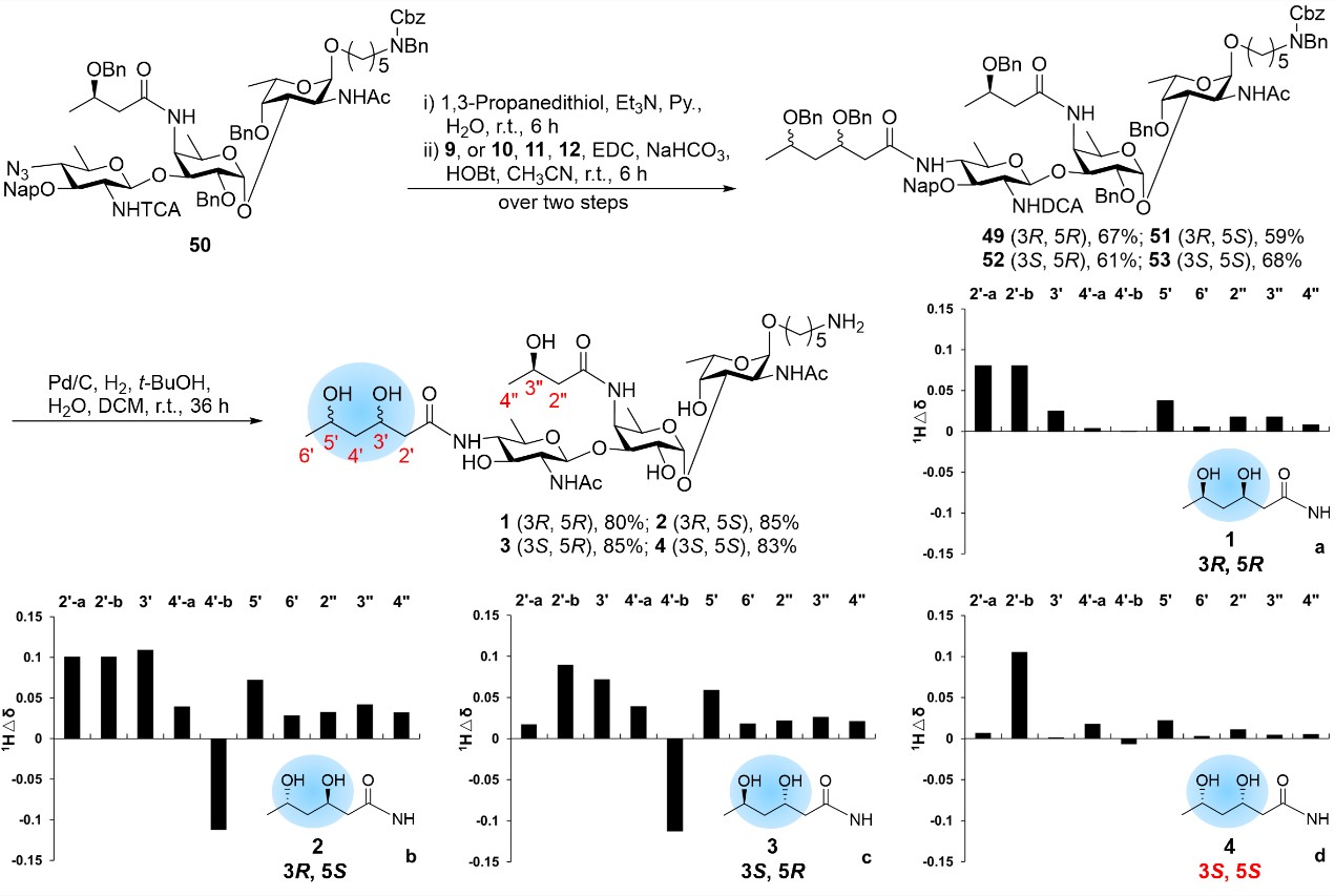 为了阐明3,5-二羟基己酰基(dHh)的绝对构型,尹健教授团队成功实现了四种潜在三糖异构体的全合成(图2)。研究中,所有dHh修饰基团均以经济易得的3-羟基丁酸甲酯为起始原料,并通过糖基化后修饰策略选择性引入了RHb和dHh基团。采用温和的1,3-丙二醇与EDC缩合试剂,不仅有效克服了三糖还原过程中1,2-反式-β-糖苷键易断裂的难题,还实现了高效的酰胺偶联反应。所有1,2-反式-β-糖苷键均通过硒苷供体构建完成。基于四种合成三糖与天然OPS的1H-NMR和13C-NMR波谱数据的对比分析,最终确定霍乱弧菌O100血清型O-抗原三糖中dHh修饰的绝对构型为3S、5S。