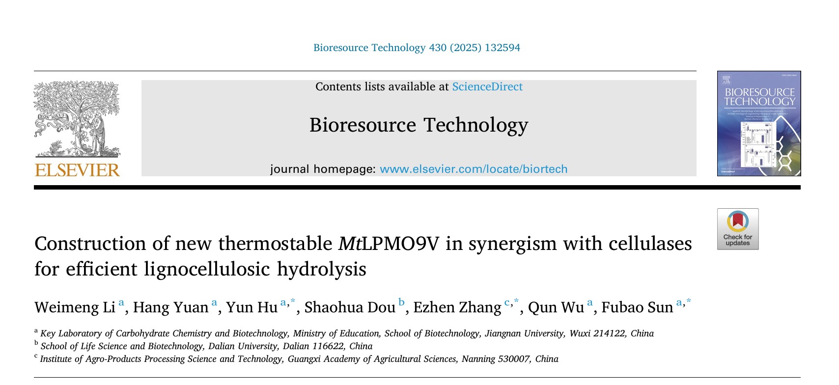 近期,beat365官网beat365中文官网生物资源与生物炼制孙付保教授团队通过对AA9家族LPMO酶进行挖掘与改造,在提升纤维素水解效率方面取得重要进展,研究成果“Construction of new thermostable MtLPMO9V in synergism with cellulases for efficient lignocellulosic hydrolysis”正式发表于Bioresource Technology(一区, Top, IF 9.7)。