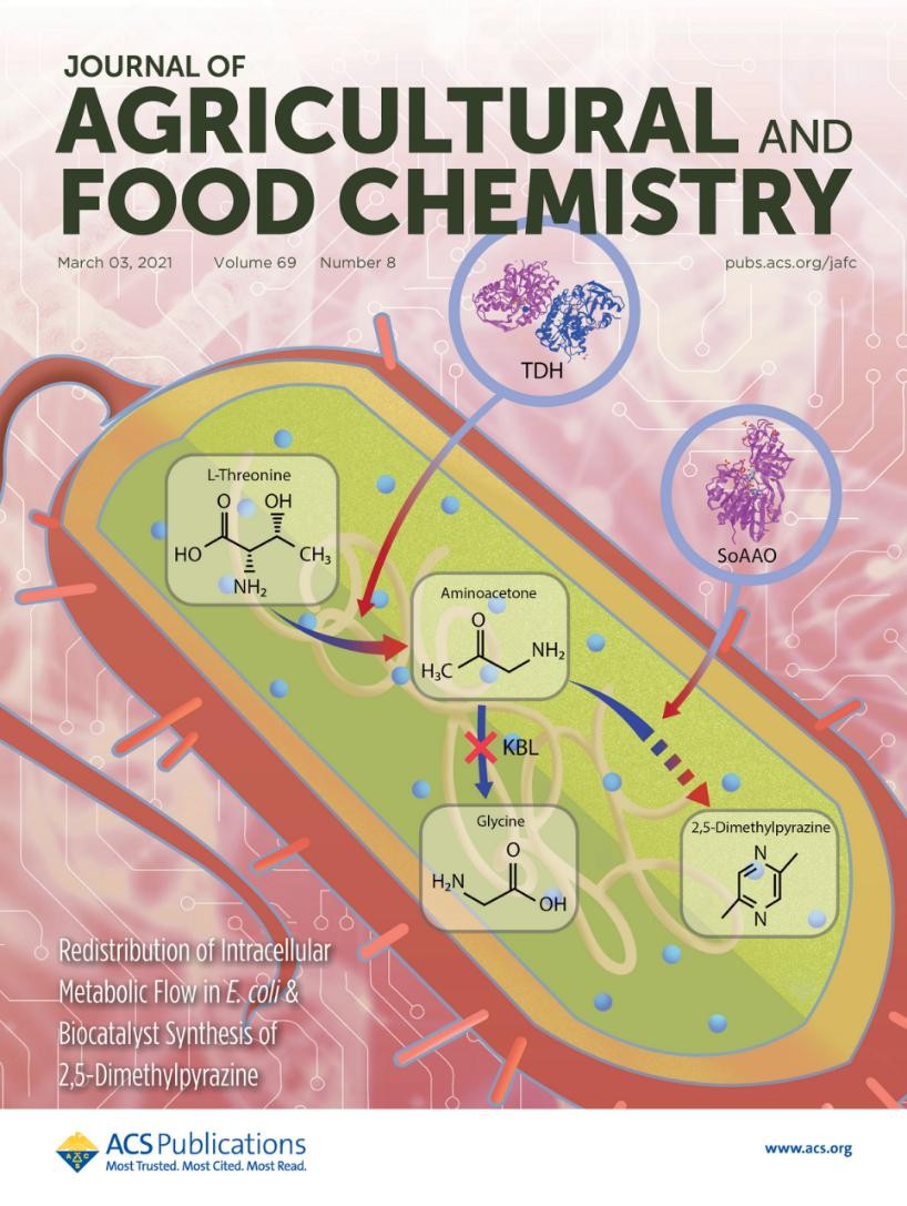 近期beat365官网beat365中文官网工业生物技术教育部重点实验室饶志明教授团队在系统生物学改造工业微生物高效合成2,5-二甲基吡嗪研究方面取得新进展。研究成果“Redistribution of Intracellular Metabolic Flow in E. coli Improves Carbon Atom Economy for High-Yield 2,5-Dimethylpyrazine Production”在线发表于美国化学学会(ACS)《Journal of Agricultural and Food Chemistry》(Top期刊、SCI一区期刊,IF: 4.192 )(J. Agric. Food Chem. 2021, 69, 8, 2576–2584)并被评选为封面论文(Front Cover)。
