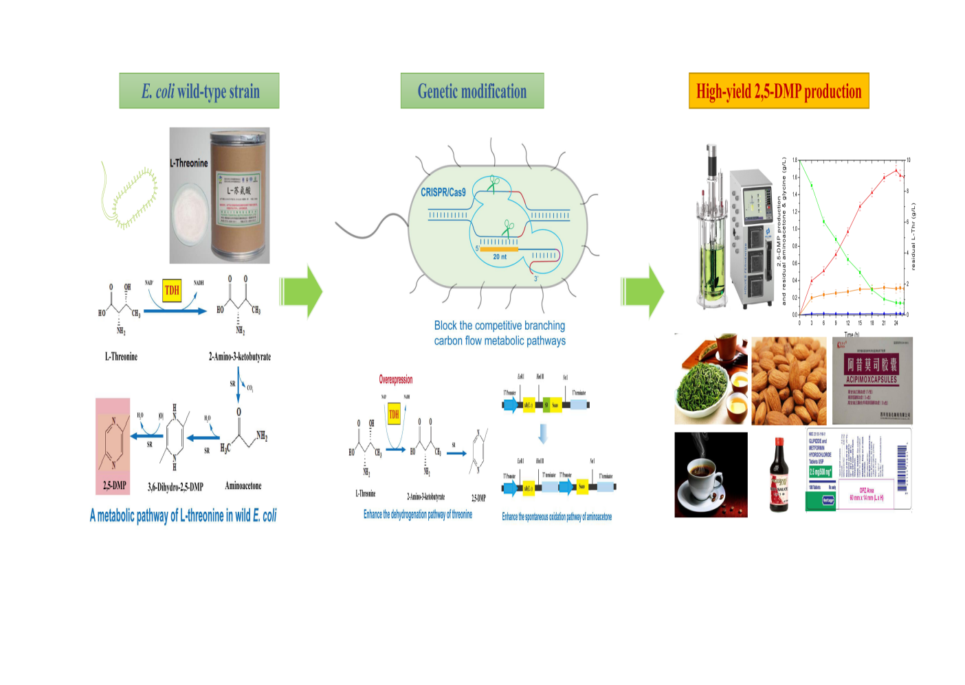 在该论文中,饶志明教授团队采用遗传操控策略对大肠杆菌细胞内代谢流进行重新分配,成功构建了碳原子得率显著提高的2,5-二甲基吡嗪细胞合成工厂。首先筛选最优来源的关键酶以促进酶催化反应过程,其次引入外源酶并通过表达调控该酶以促进非酶催化过程,最后利用CRISPR-cas9阻断强竞争碳流分支代谢途径进而构建合适的底盘细胞,最终碳原子得率提高到30.2%,为目前报道最高水平。此外,本研究以L-苏氨酸为底物合成2,5-二甲基吡嗪,而L-苏氨酸目前广泛运用于食品、饲料以及医药行业,由于成本低廉,产能逐渐过剩,如今已经市场饱和,所以本研究通过构建高产2,5-二甲基吡嗪重组菌株,将低值化合物L-苏氨酸高值化,解决了产能过剩的问题,提高了经济效益。该研究为微生物高效合成2,5-二甲基吡嗪提供重要借鉴。