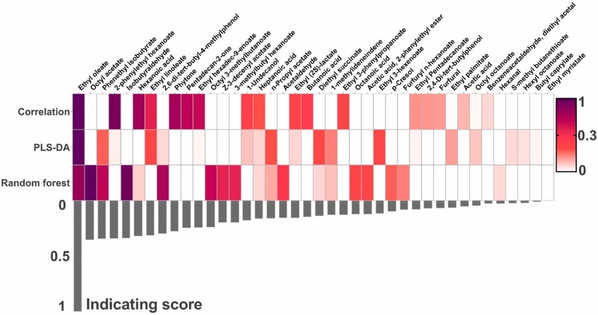图2. 通过相关性分析、偏最小二乘判别分析以及随机森林得到的时间标志性化合物的重要性排序