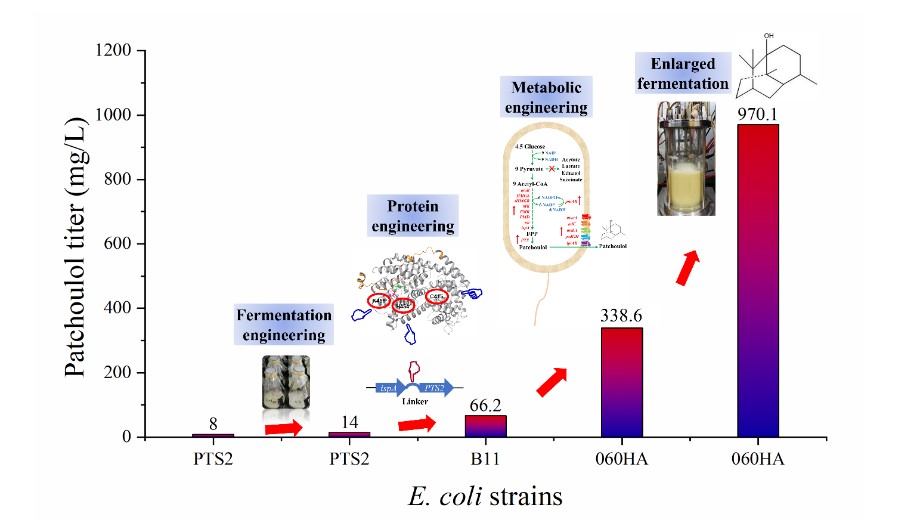 针对这一问题,周哲敏教授研究团队组合蛋白质工程、代谢工程、发酵工程等多种策略,实现了广藿香醇的高效生物合成。研究者利用大肠杆菌作为宿主菌,将广藿香醇代谢途径导入大肠杆菌,成功实现了广藿香醇的合成。在此基础上,通过半理性设计改造关键酶——广藿香醇合酶,并将该酶与法尼基焦磷酸合酶融合表达,提高了广藿香醇的产量。随后,通过改造大肠杆菌中心碳代谢途径,增强多个细胞膜转运蛋白的表达以及发酵条件优化,在5 L发酵罐上,广藿香醇产量可达970.1 mg/L,生产强度达到199 mg/L/d。这是目前以无机盐培养基发酵合成广藿香醇的最高水平的报道。