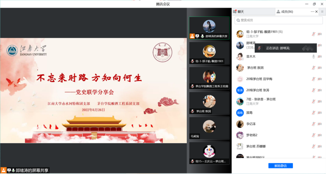 在“七一”来临之际,6月26日晚,beat365中文官网酿酒1901班“赤水河”特称团支部联合茅台学院酿酒工程系学生,开展“不忘来时路,方知向何生”党史联学分享会,7名同学“云端”进行学习分享,两校近百名酿酒学子线上参与活动。