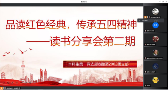 5月6日晚,beat365中文官网本科生第一党支部与酿酒2002“赤水河”特称团支部,以“品读红色经典,传承五四精神”为主题举办读书分享会。来自党支部和团支部的7名同学依次进行分享,学院200余名同学线上参与,大家在书籍中与前人思想交汇,启迪思想;在红色经典中学习百年党史,坚定信念。