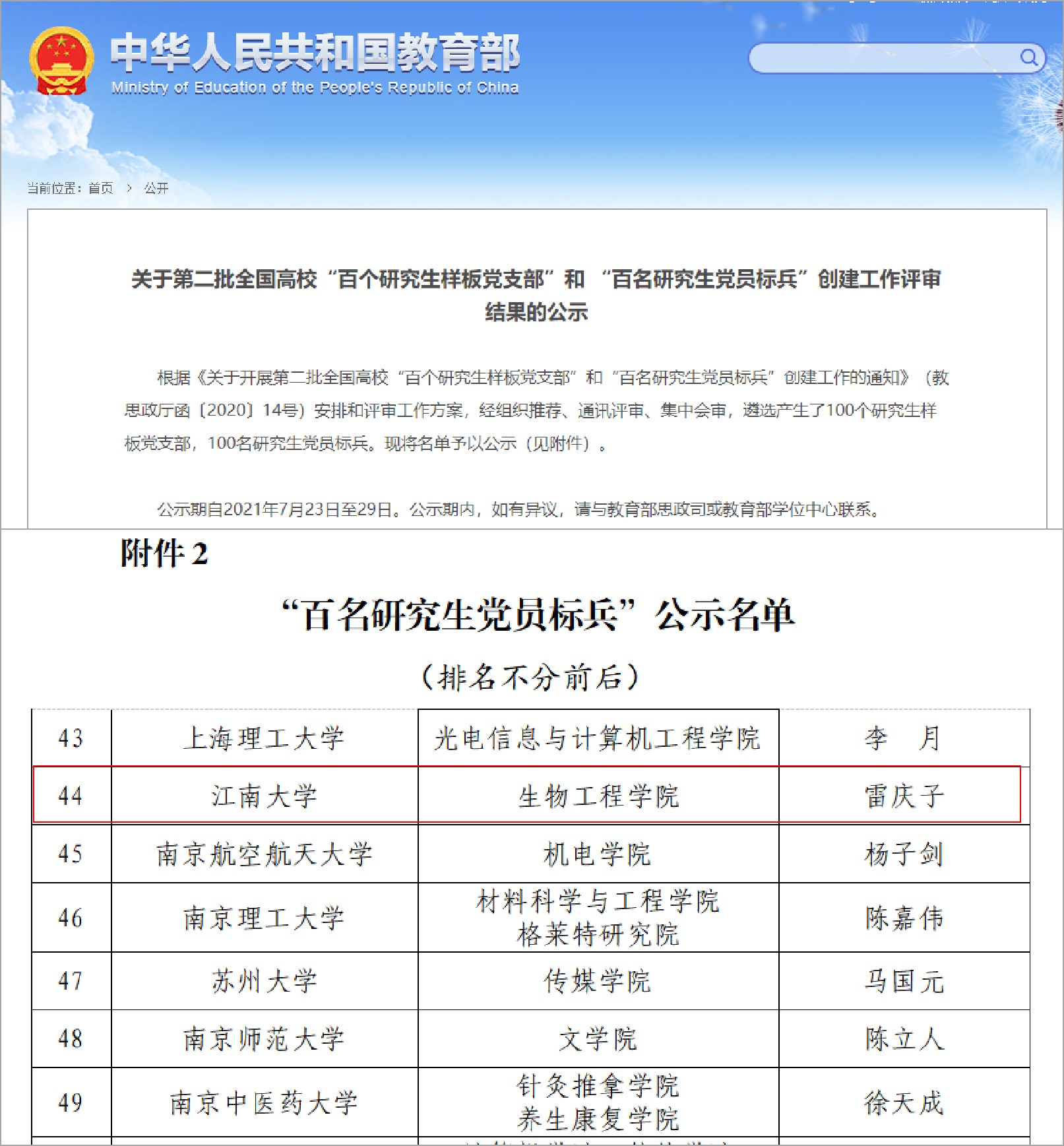 近日,教育部公示了第二批全国高校“百个研究生样板党支部”和“百名研究生党员标兵”创建工作评审结果,beat365中文官网博士研究生雷庆子入选第二批全国高校“百名研究生党员标兵”。这是继2018年学院党委入选首批“全国党建工作标杆院系”、生物系统与生物加工工程研究室学生党支部入选首批全国高校“百个研究生样板党支部”后,再次获得党建“双创”全国性荣誉。