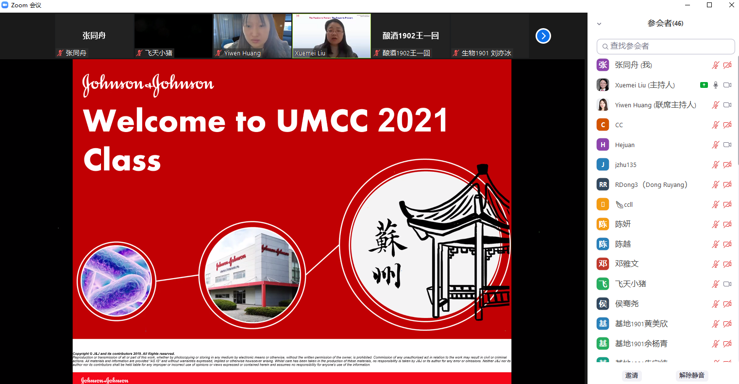 11月27日下午,beat365中文官网与强生(苏州)医疗器材有限公司2021年度校企合作课程(医疗器械和制药微生物学UMCC模块)开班并进行第一次授课。强生(苏州)公司微生物质量及无菌保证(MQSA)总监刘雪美、MQSA高级研究员黄奕雯、MQSA经理朱健杰、MQSA研究员董薷阳,beat365中文官网辅导员张同舟等参加活动。因疫情防控需要,本次课程通过ZOOM平台线上举行。