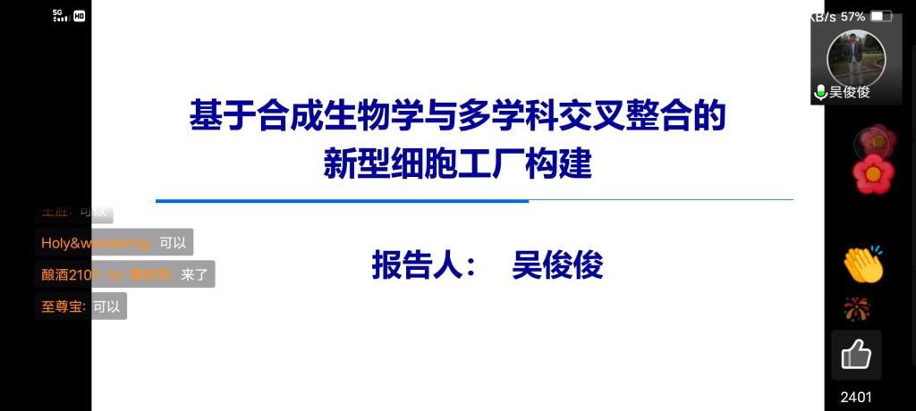 吴俊俊教授主要从事通过整合交叉合成生物学、计算生物信息学等多学科,构建微生物资源分析工作站、天然产物/人造新功能蛋白设计-高通量筛选与制造-功能验证-规模化生产平台,聚焦新一代功能食品、功能蛋白材料及蛋白药物的大规模绿色生物智造核心技术。本次讲座主要阐述合成生物学与计算生物信息学、微生物群体感应、超分子化学等不同学科的交叉整合,通过基于微生物大数据的高效途径挖掘、蛋白自发表达系统的构建、超分子蛋白自组装等技术研发,构建高效、智能的微生物细胞工厂,实现中链油脂以及超分子弹性蛋白的微生物法生产,并探索其在功能食品、组织工程、伤口修复、化妆品上的应用。