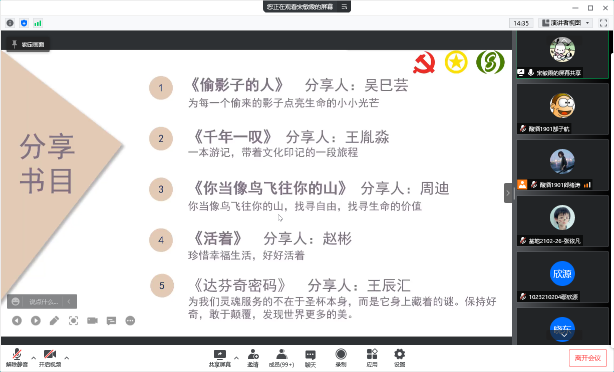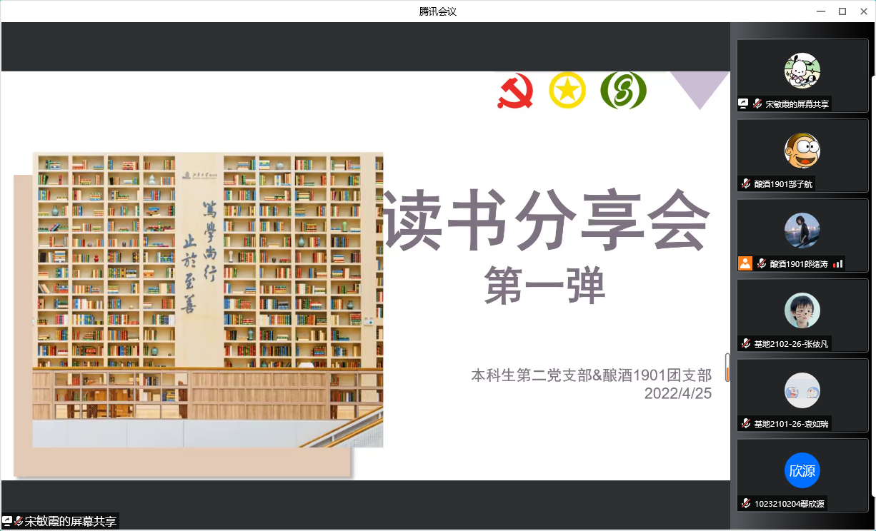 4月25日晚,beat365中文官网本科生第二党支部、酿酒1901班“赤水河”特称团支部联合举办了“书海遨游拾贝”读书分享会。来自党支部和团支部的5名同学依次分享了推荐书籍,100余名同学聆听分享。在思想碰撞中,大家的视野得以打开,收获颇丰。