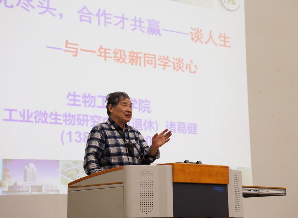 随后,诸葛健老师向同学们讲述了自己进行科学研究、服务产业的经历,他以创新典范丁耀坤老师为榜样,培养了终身从教的情怀,并致力于在国内外舞台中传播和发扬发酵精神,开创工业微生物育种新篇,用科研成果促进教学。在一段段故事中,同学们被诸葛健老师不畏艰苦、敢于斗争的精神撼动,同时也意识到团队合作的重要性,要在实践中勇于创新、勇于担当。