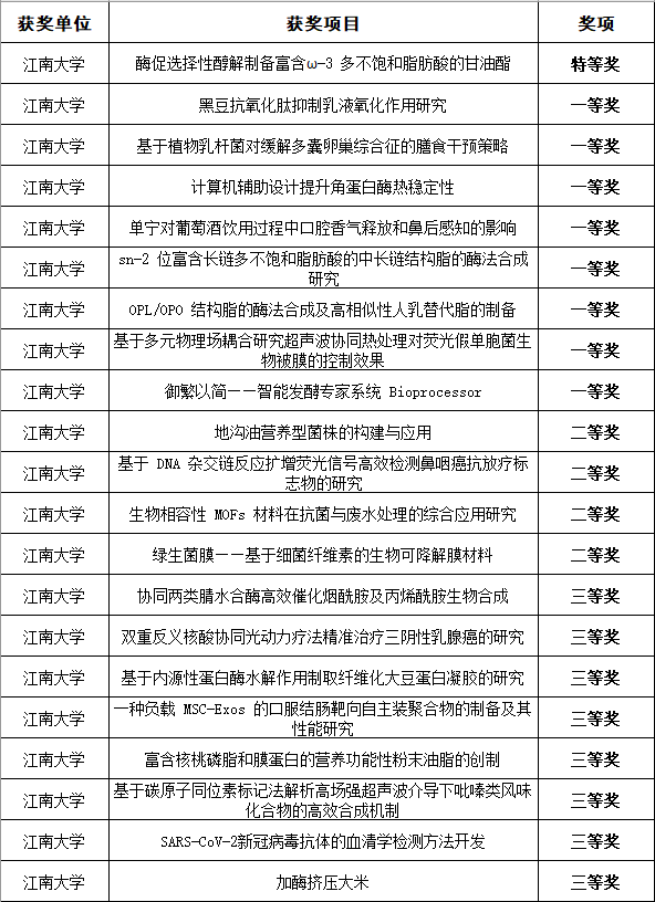 本届大赛受疫情影响,全程采用网络方式完成。经过材料初审和复赛,beat365官网9个学生项目入围决赛。经过激烈角逐,食品学院李才明、王小三老师指导,陈烨等同学参赛的《酶促选择性醇解制备富含ω-3多不饱和脂肪酸的甘油酯》斩获特等奖。食品学院郑召君、徐勇将老师指导,艾子璇等同学参赛的《黑豆抗氧化肽抑制乳液氧化作用研究》,食品学院王刚老师指导,石刘婷等同学参赛的《基于植物乳杆菌对缓解多囊卵巢综合征的膳食干预策略》,生命科学与健康工程学院龚劲松、苏畅老师指导,江佳宇等同学参赛的《计算机辅助设计提升角蛋白酶热稳定性》,beat365中文官网唐柯老师指导,师戈图等同学参赛的《单宁对葡萄酒饮用过程中口腔香气释放和鼻后感知的影响》,食品学院邹孝强、黄健花老师指导,李亚茹等同学参赛的《sn-2位富含长链多不饱和脂肪酸的中长链结构脂的酶法合成研究》,食品学院王小三老师指导,赵昕辰等同学参赛的《OPL/OPO结构脂的酶法合成及高相似性人乳替代脂的制备》,食品学院姚卫蓉、于航老师指导,姜琳等同学参赛的《基于多元物理场耦合研究超声波协同热处理对荧光假单胞菌生物被膜的控制效果》,beat365中文官网张玲、杨海麟老师指导,张一冉等同学参赛的《御繁以简——智能发酵专家系统Bioprocessor》均荣获一等奖。