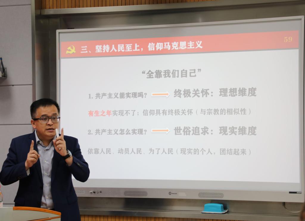5月23日,“青马工程”培训班理论学习系列讲座第三讲,由beat365中文官网马克思主义学院唐忠宝教授以《学习新思想坚定理论自信》为题开讲。唐忠宝教授围绕学习贯彻习近平新时代中国特色社会主义思想,以党的二十大精神为切入点,聚焦“十个明确”的精神实质和丰富内涵,重点从“反对历史虚无主义”“坚持中国式现代化”“信仰马克思主义”等方面着眼分析,以当今网络热点话题讨论为案例开展解读和交流,旨在深入浅出地以年轻人喜闻乐见的宣讲形式和思维方式,向青马班学员传播新时代新思想,引导广大青年树立正确价值观、厚植爱国情怀,与国家同呼吸、与人民共命运,唐忠宝教授的精彩分享为全体学员带来一场耳目一新的思想盛宴。